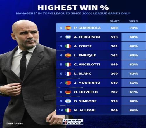 近日,瓜迪奧拉在執(zhí)教頂級五大聯(lián)賽比賽中達(dá)到了600場里程碑——下面是達(dá)成這一里程碑的教練勝率排行榜,展示誰在這些“至少 200 場”高強度聯(lián)賽中效率最高。