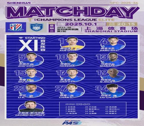 上海申花首發(fā):1-薛慶浩、4-蔣圣龍、5-朱辰杰、10-特謝拉、13-馬納法、15-吳曦、17-高天意、19-阿蘇埃、23-李可、27-陳晉一、34-劉誠宇