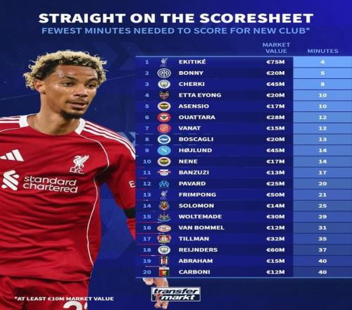 夏窗新援德轉(zhuǎn)身價(jià)及最快攻入首球時(shí)間