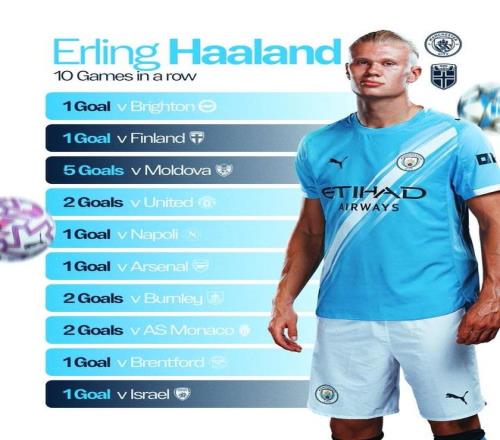 比賽第27分鐘,哈蘭德單刀破門,根據(jù)統(tǒng)計(jì),他已經(jīng)在俱樂部和國家隊(duì)的連續(xù)10場比賽中打入進(jìn)球,上一次沒進(jìn)球還是在8月份英超第二輪曼城主場0-2輸給熱刺的比賽。