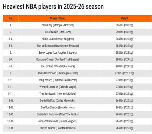 在這份榜單中,灰熊的扎克·埃迪以138公斤排名聯(lián)盟第一,爵士的努爾基奇132公斤緊隨其后。減重后的錫安與約基奇都是129公斤,并列排名第三??齑拇舐?、開拓者的克林根、76人的恩比德和德拉蒙德分列第4到第8位。