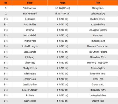此外,有16名球員的身高正好是6英尺,也就是1米83,其中包括了保羅、范弗里特、康利、洛瑞、阿爾瓦拉多等多位叱咤NBA的名將。