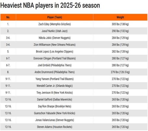 NBA現(xiàn)役最重球員排名:楊瀚森122公斤第9扎克伊迪居首約基奇第3