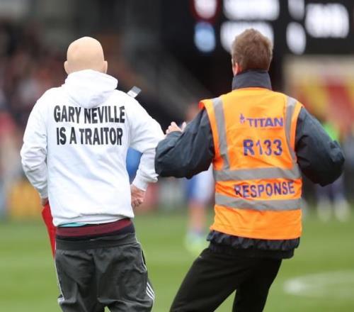 兩男子穿著印有“加里內(nèi)維爾是叛徒”的衣服,沖入英乙賽場