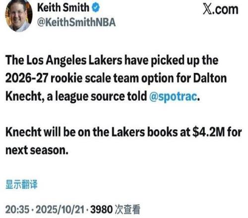 北京時間10月21日,根據(jù)NBA記者Keith Smith報道,湖人已經(jīng)執(zhí)行24歲年輕球員克內(nèi)克特的2026-27賽季價值420萬美元的球隊選項(xiàng)。只是克內(nèi)克特自從上賽季交易告吹后,他重返湖人就狀態(tài)持續(xù)下滑,在此前的季前賽表現(xiàn)被外界批評為“負(fù)資產(chǎn)”,湖人想要交易存在困難。