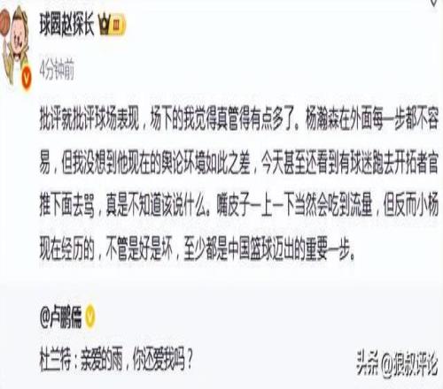 另外一個媒體人“趙探長”轉(zhuǎn)發(fā)評論說道:“批評就批評球場表現(xiàn),場下的我覺得真管得有點多了。楊瀚森在外面每一步都不容易,但我沒想到他現(xiàn)在的輿論環(huán)境如此之差,今天甚至還看到有球迷跑去開拓者官推下面去罵,真是不知道該說什么。