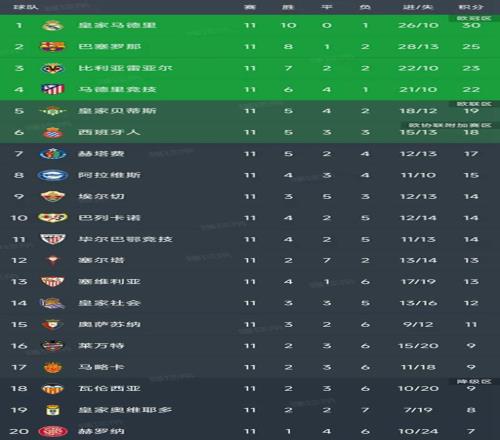西甲第11輪結束了所有比賽,最新積分榜如下!