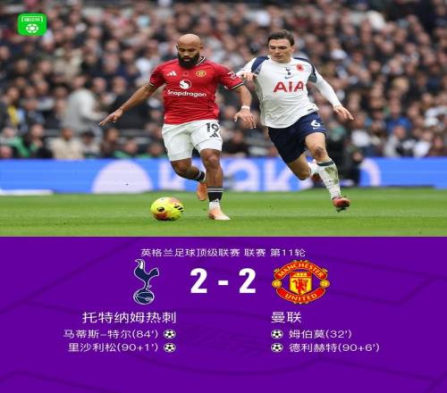 北京時(shí)間11月8日,英格蘭足球超級(jí)聯(lián)賽第11輪展開(kāi)角逐,托特納姆熱刺坐鎮(zhèn)主場(chǎng)迎戰(zhàn)曼聯(lián)。比賽中,曼聯(lián)率先打破僵局,阿馬德-迪亞洛送出助攻,姆伯莫完成破門,幫助球隊(duì)取得領(lǐng)先。托特納姆熱刺在終場(chǎng)前發(fā)起反撲,烏多基送出精準(zhǔn)傳球,馬蒂斯-特爾抓住機(jī)會(huì)扳平比分。隨后在傷停補(bǔ)時(shí)階段,奧多貝爾射門被里沙利松蹭進(jìn)球門將比分反超。然而曼聯(lián)并未放棄,讀秒階段,德利赫特頭球破門,再度將比分扳平。 最終全場(chǎng)比賽結(jié)束,托特納姆熱刺與曼聯(lián)以2比2握手言和。