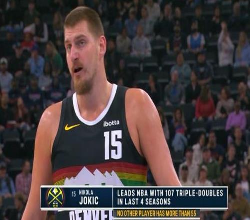 比賽期間,轉(zhuǎn)播方給出一組數(shù)據(jù):在過(guò)去四個(gè)賽季中,約基奇共完成了107次三雙,而其他球員最多則不超過(guò)55次三雙。
