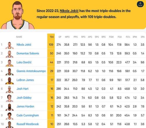 獨(dú)一檔,約基奇過(guò)去4個(gè)賽季砍下109次三雙,第二名小薩僅50次