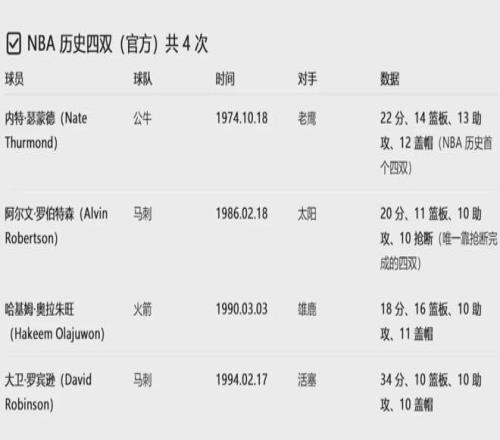 NBA官方承認(rèn)的四雙,歷史上只有4次:瑟蒙德22分14籃板13助攻12蓋帽;埃爾文-羅伯特森20分11籃板10助攻10搶斷;奧拉朱旺18分16籃板10助攻11蓋帽;大衛(wèi)-羅賓遜34分10籃板10助攻10蓋帽。羅伯特森是唯一的搶斷四雙!