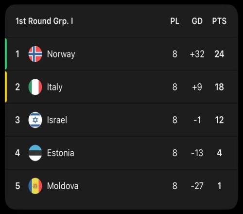 本屆世預(yù)賽,挪威隊(duì)同意大利、以色列、愛沙尼亞和摩爾多瓦同處I組。起初,外界都認(rèn)為意大利隊(duì)是直接晉級(jí)的最大熱門。隨著比賽的進(jìn)行,哈蘭德、厄德高兩大英超球星領(lǐng)銜的挪威隊(duì),成為了I組最大的黑馬。他們?cè)谑李A(yù)賽中火力全開,8戰(zhàn)全勝狂轟37球只丟5球,以絕對(duì)優(yōu)勢(shì)排名I組榜首。