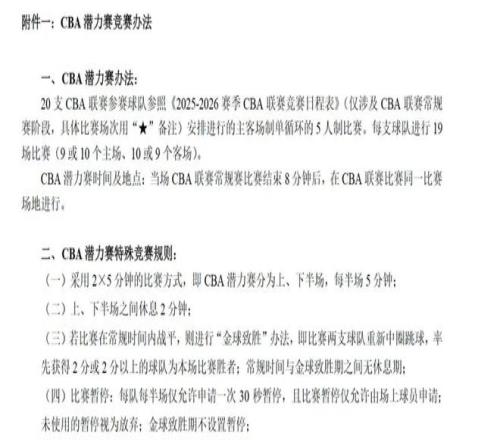 中國籃協(xié)的一紙公告讓整個籃球圈炸開鍋!2025-26賽季CBA聯(lián)賽將迎來史上最顛覆性改革:常規(guī)賽每節(jié)時間從12分鐘縮短至10分鐘,更震撼的是新增設(shè)“第五節(jié)”——專屬替補球員的“CBA潛力賽”。這項開創(chuàng)世界先河的賽制,將在常規(guī)時間結(jié)束8分鐘后開打,分為上下半場各5分鐘,戰(zhàn)平則啟動“金球致勝”規(guī)則,瞬間決定勝負。