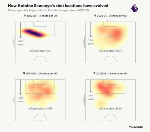 他理想情況下可以擔(dān)任曼聯(lián)3-4-3陣型中的右側(cè)攻擊型中場(chǎng),但也能勝任兩翼,并且具備防守意識(shí),可以適應(yīng)邊翼衛(wèi)的位置之一。阿莫林偏愛(ài)雙腳均衡的邊路球員,這使他能夠指導(dǎo)鋒線三人和邊翼衛(wèi)在進(jìn)攻三區(qū)進(jìn)行更多的輪轉(zhuǎn)換位,從而更好地破解密集防守。這位加納國(guó)腳快速的帶球突破和大幅改善的射門狀態(tài)(如下方圖表所示,該圖表顯示他對(duì)射門的選擇變得更加精挑細(xì)選),也將使他成為球隊(duì)在由守轉(zhuǎn)攻時(shí)的又一個(gè)出色的反擊選擇,而曼聯(lián)在攻防轉(zhuǎn)換階段的威脅是最大的。