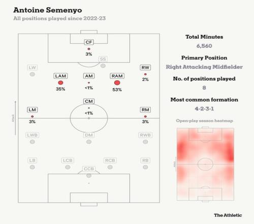 斯洛特希望他的邊鋒具備進(jìn)球威脅并且在一對(duì)一情況下表現(xiàn)出色,而這正是塞門約擅長(zhǎng)的領(lǐng)域。他的速度將為利物浦的鋒線帶來(lái)受歡迎的補(bǔ)充,而且他雙腳均衡,可以勝任兩翼。如下方圖表所示,塞門約在位置上具有多面性。