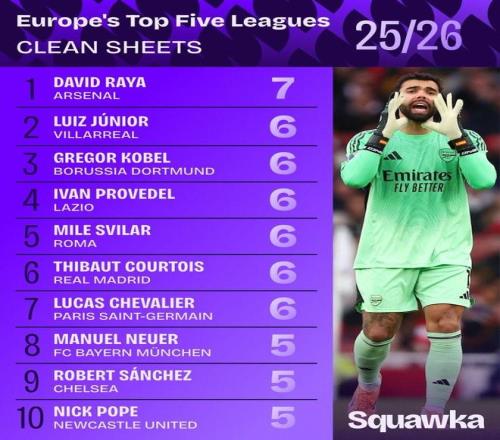 數(shù)據(jù)統(tǒng)計(jì)機(jī)構(gòu)Squawka統(tǒng)計(jì)出本賽季截至目前五大聯(lián)賽門將零封榜,戴維-拉亞7次零封居首。
