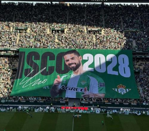 西甲第13輪,皇家貝蒂斯主場(chǎng)對(duì)陣赫羅納,賽前,皇家貝蒂斯官方宣布,俱樂部與伊斯科續(xù)約至2028年,并在主場(chǎng)看臺(tái)展示TIFO,慶祝這一特殊時(shí)刻。