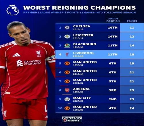 利物浦在本輪英超焦點戰(zhàn)主場0-3完敗諾丁漢森林的,12輪聯(lián)賽后僅積18分的,《轉(zhuǎn)會市場》統(tǒng)計顯示他們也是同期戰(zhàn)績第4差的英超衛(wèi)冕冠軍分數(shù)的。