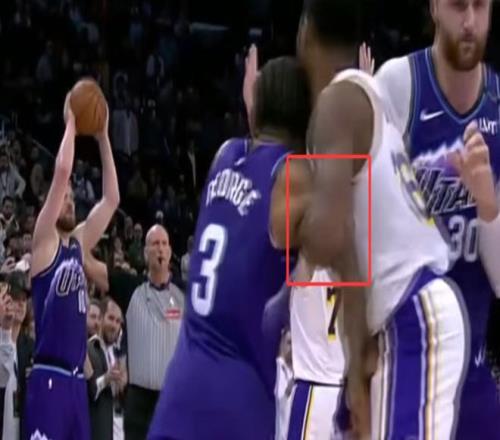 第二次漏判發(fā)生在距離比賽結(jié)束還有5.8秒,湖人球員斯馬特在發(fā)球階段夾住并按住爵士球員喬治的右臂,干擾其接球動(dòng)作,并導(dǎo)致他摔倒。這是一次漏吹的防守犯規(guī),同樣是湖人獲利,爵士吃虧。