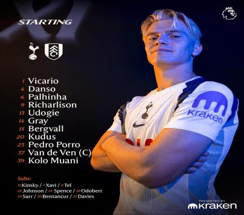 熱刺首發(fā):1-維卡里奧、23-波羅、4-丹索、37-范德芬、13-烏多基、6-帕利尼亞、14-阿奇-格雷、15-貝里瓦爾、20-庫(kù)杜斯、9-里沙利松、39-穆阿尼