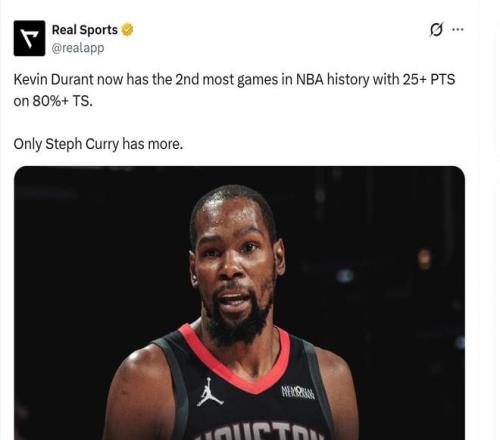 此役,杜蘭特還創(chuàng)下了NBA歷史第2神跡。數(shù)據(jù)顯示,這是杜蘭特生涯第69次單場(chǎng)砍下25+且真實(shí)命中率超過80%,與詹姆斯哈登并列歷史第二,僅次于斯蒂芬?guī)炖铮?02場(chǎng))!