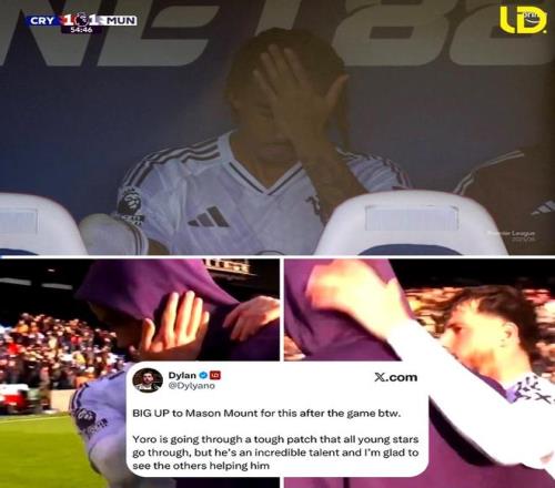 除了打入一球,芒特在賽后安撫年輕隊(duì)友萊尼·約羅的舉動(dòng),也讓他備受贊譽(yù)。20歲的法國(guó)中衛(wèi)不僅犯規(guī)送給馬特塔點(diǎn)球,而且還有其他幾次失誤,幸好水晶宮沒(méi)有把握好機(jī)會(huì),否則曼聯(lián)可能不只落后一球。因此,下半場(chǎng)初段,約羅就被阿莫林換下,他坐在替補(bǔ)席上掩面懊惱。