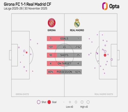 此役客場對陣赫羅納,皇家馬德里嘗試了25次射門,其中4次射正,最終僅打入一粒點球,1-1戰(zhàn)平對手。