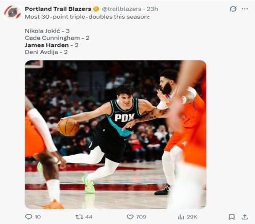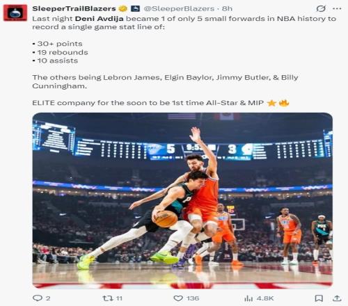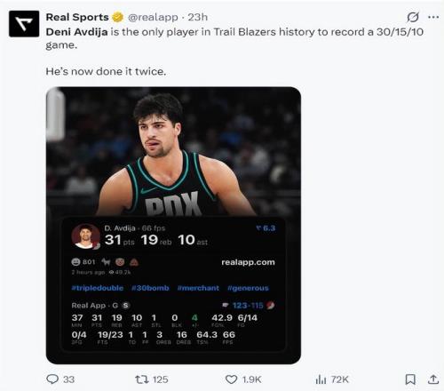 4.阿夫迪亞是開拓者隊(duì)史首位兩次30+15+10三雙的球員;