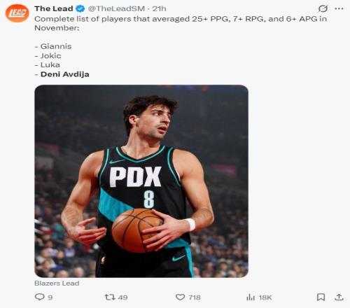 5.本賽季只有揚(yáng)尼斯、約基奇、東契奇、阿夫迪亞場均達(dá)成25+7+6;