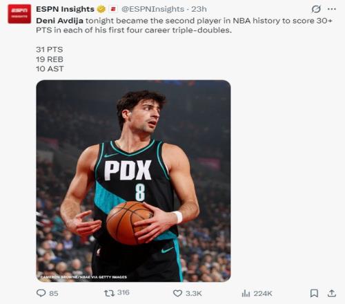3.阿夫迪亞成為NBA歷史第二位,生涯前四次三雙有兩次30+三雙的選手;
