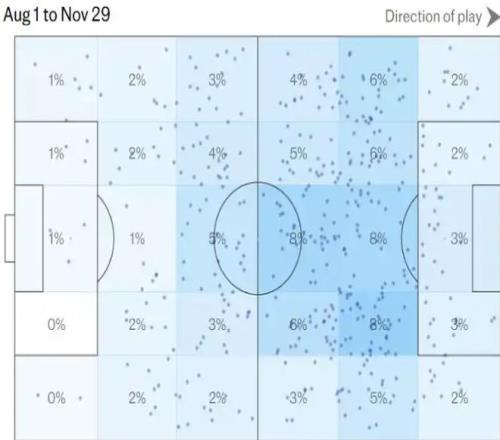 本場(chǎng)他完成44次傳球,僅失誤2次,成功率高達(dá)95%。這與本賽季對(duì)陣布倫特福德(76%)和水晶宮(84%)時(shí)的低迷形成了鮮明對(duì)比。