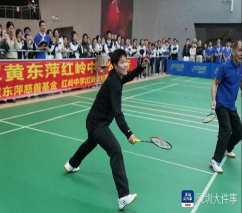 互動環(huán)節(jié)的高潮,是一場別開生面的羽毛球友誼賽。黃東萍與深圳市慈善會副會長徐剛搭檔,組成“公益組”,對陣由紅嶺中學(xué)(集團)黨委書記、校長張健與教師代表邱光宏老師組成的“教育組”。