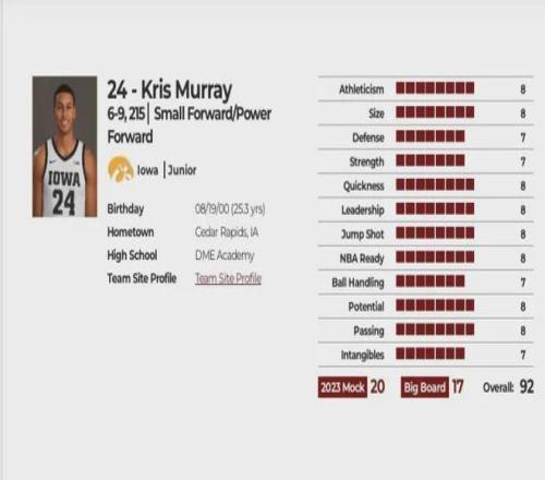 我們看一下2023年他在NBA draft 網站的選秀報告(略有刪減),綜合評分92分,在防守、強壯度、持球、無形資產方面評分較低,預計選秀順位17-20順位(實際第23順位),選秀模板多里安-芬尼-史密斯。