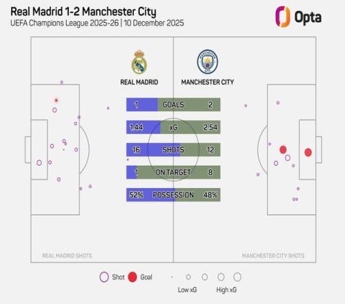 歐冠聯(lián)賽階段第6輪,皇家馬德里主場1-2不敵曼城,此役皇馬僅1次射正,為有統(tǒng)計以來皇馬歐冠主場最低。