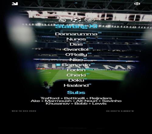 北京時(shí)間12月11日04:00,歐冠 聯(lián)賽階段 第6輪,皇家馬德里主場(chǎng)迎戰(zhàn)曼城,賽前雙方球隊(duì)首發(fā)名單公布如下: