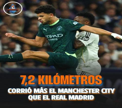 相差7.2分公里,曼城全隊跑動119公里,皇馬跑動111.8公里