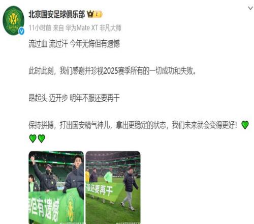 賽后,國安球員拉出兩張橫幅,第一張上面寫著:“流過血 流過汗 今年無悔但有遺憾”。第二張印著:“昂起頭 邁開步 明年不服還要再干”。俱樂部官微上還打出一句話:“保持拼搏,打出國安精氣神兒,拿出更穩(wěn)定的狀態(tài),我們未來就會變得更好!”