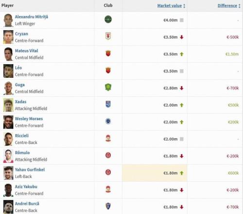北京時間12月17日,德轉(zhuǎn)更新新一期中超球員身價。本期榜單前18均為外籍球員。外援身價榜前十中,浙江隊外援米特里策以400萬歐居首,克雷桑、維塔爾、萊昂納多并列第二。
