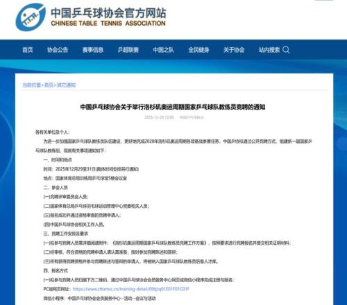 中國乒乓球協(xié)會官網(wǎng)于12月20日正式發(fā)布了《中國乒乓球協(xié)會關(guān)于舉行洛杉磯奧運周期國家乒乓球隊教練員競聘的通知》,標志著為期三天的新周期國家隊教練員公開競聘工作將于本月29日正式啟動。