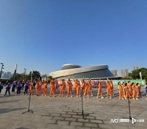 江門市體育中心體育館門前的氛圍點同樣高潮迭起,屢獲各級賽事大獎的范羅岡濱江小學雅范合唱團以純凈童聲唱響粵語版《氣勢如虹》《冬至燒雞》《星辰大?!罚辶恋母杪暢蔀橘惖郎献顒尤说摹澳芰垦a給”。