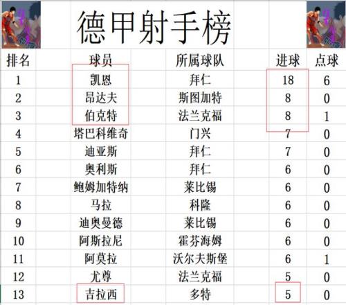 射手榜方面,凱恩18球高居榜首,已經(jīng)領(lǐng)先第2的昂達(dá)夫,伯克特10球之多。迪亞斯,塔巴科維奇7球并列第4,吉拉西今天進(jìn)球被吹掉,無(wú)緣追上鮑姆加特納,阿莫拉等人,還是差1球才能擠入前十。