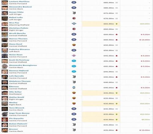 北京時間12月23日,意甲身價更新:勞塔羅8500萬歐居首,尼科-帕斯?jié)q至6500萬歐。