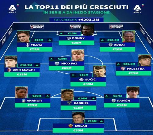 德轉(zhuǎn)意甲本賽季至今身價漲幅最高11人陣容: