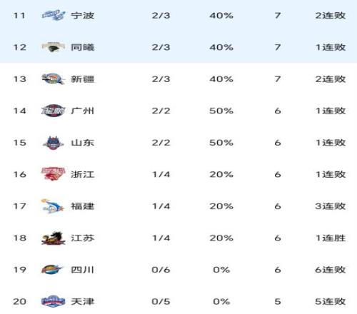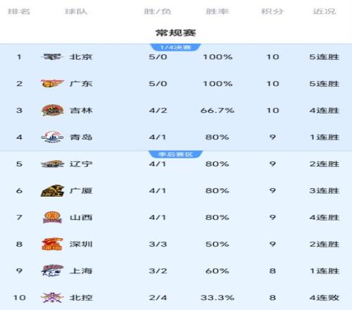 從以上積分榜來看,聯(lián)盟只有北京隊、廣東隊開局五連勝,吉林隊多賽一輪4勝2負升入第三,青島隊、遼寧隊、廣廈隊、山西隊都是4勝1負的戰(zhàn)績。此外,全敗球隊僅剩天津隊、四川隊。