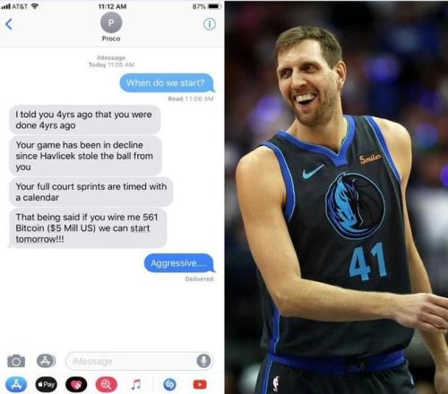 北京時間今日,美媒NBA Memes曬出了一張獨行俠傳奇球星德克-諾維茨基與其訓練時的聊天記錄,記錄中兩人就諾維茨基的訓練內(nèi)容進行了交流。
