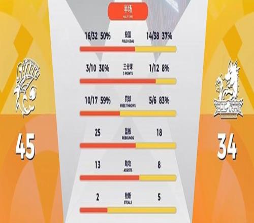 半場戰(zhàn)罷,上海男籃45比34領(lǐng)先,江蘇隊(duì)半場投籃命中率不足4成,3分球更是12投1中,整體手感糟糕。