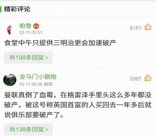 關(guān)于曼聯(lián)可能會(huì)在圣誕節(jié)前破產(chǎn)的言論,多數(shù)球迷并不買賬,認(rèn)為“資本家哭窮是有一套的”、“早早把曼聯(lián)賣給石油老板就完了”。