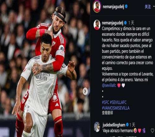 塞維利亞中場(chǎng)古德利近日在社交媒體分享了客場(chǎng)對(duì)陣皇家馬德里時(shí)的比賽照片,并配文表達(dá)了球隊(duì)雖表現(xiàn)出色卻未能取分的遺憾與對(duì)未來(lái)的信心?;蜀R中場(chǎng)貝林厄姆在評(píng)論區(qū)幽默留言稱(chēng):“哇,好用力地?fù)肀О。值?!?/p>