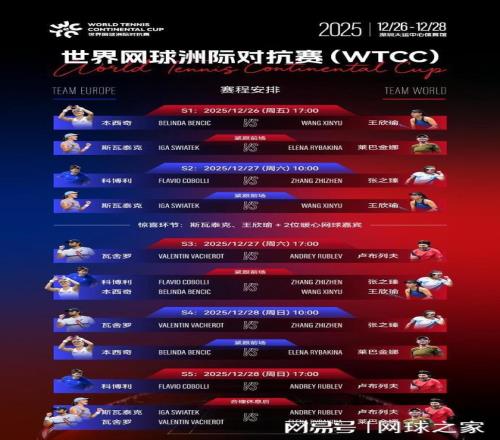 我們?cè)賮?lái)關(guān)注一項(xiàng)表演賽。北京時(shí)間今天下午5點(diǎn),世界網(wǎng)球洲際對(duì)抗賽(WTCC)將在深圳大運(yùn)中心體育館開(kāi)打。波蘭名將斯瓦泰克、哈薩克斯坦名將萊巴金娜、瑞士名將本西奇、俄羅斯名將盧布列夫、意大利新星科博利、摩納哥人瓦舍羅等一眾球星將和中國(guó)球員張之臻、王欣瑜一道,為球迷奉獻(xiàn)一場(chǎng)精彩的年終網(wǎng)球盛宴。