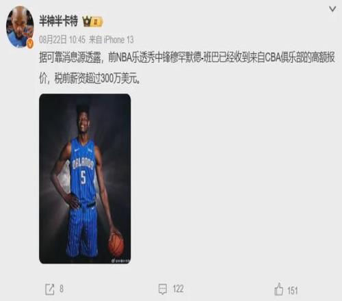 據(jù)國內(nèi)媒體人報道,曾有CBA俱樂部瘋狂大出血,向班巴報價薪資稅前超過300萬美元,可是顯而易見人家不為所動。